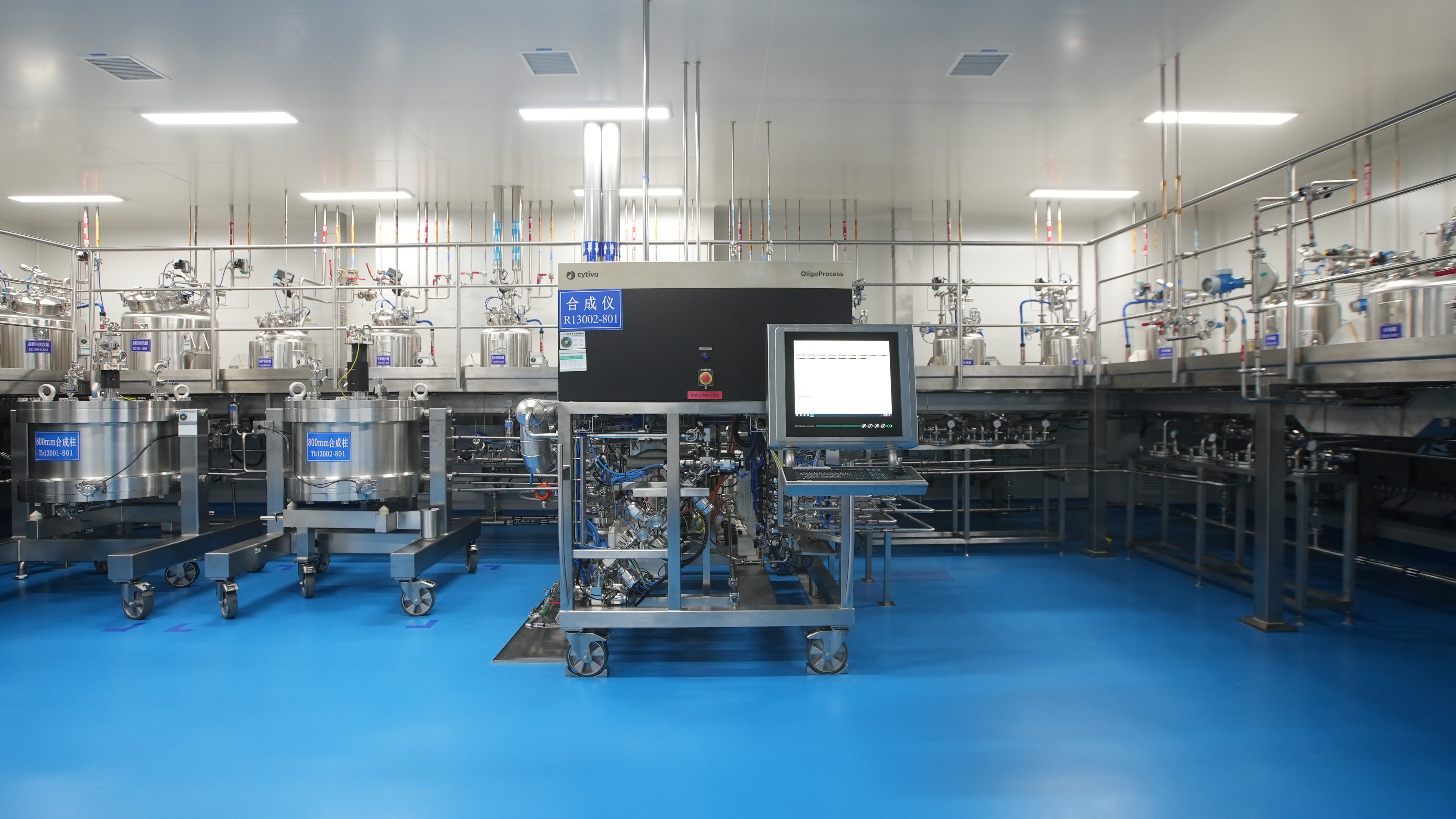 新投产车间约5800平方米,引进全球领先的Cytiva OligoProcess合成仪、BioProcess纯化仪、Sartorius CF10‑CF40系列超滤系统及冻干机等核心生产设备。车间系统配置400‑1000mm规格合成柱、纯化柱超13套,并搭载全新设计的全密闭一体化自动在线氨解系统,大幅缩短批次间非工艺时间,有效提升年产批次效率。